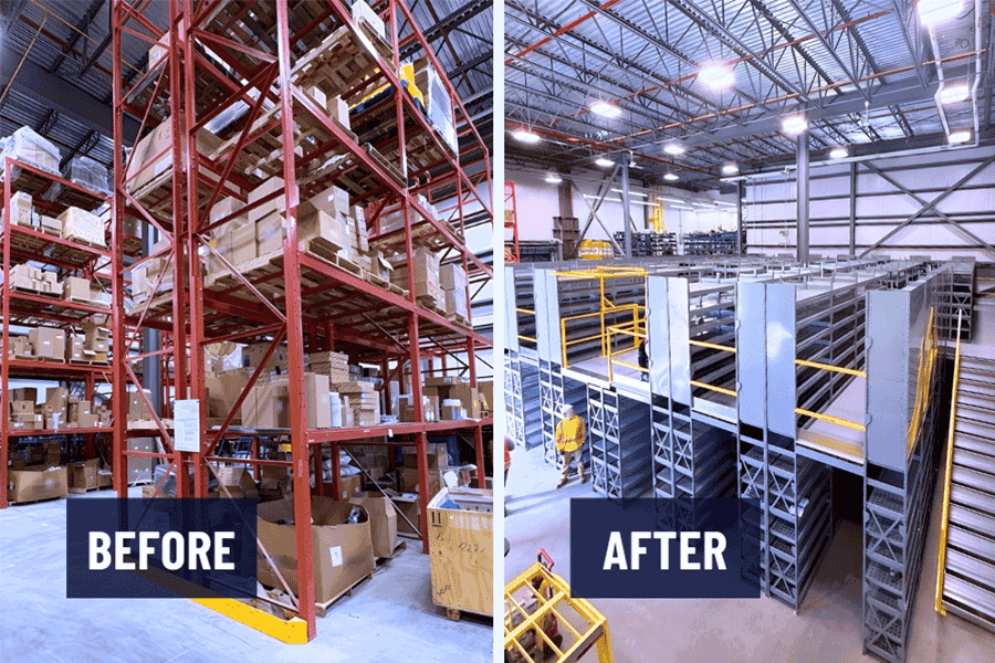 With this previous warehouse design, the client was suffering from longer order picking cycles due to storing handpicked items in their mezzanines, which resulted in further travel distances for their warehouse workers, which created less efficient operations and a bottle neck in a key aspect of their distribution business.